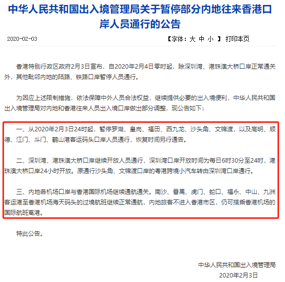 一、从2020年2月3日24时起,暂停罗湖、皇岗、福田、西九龙、沙头角、文锦渡,以及高明、顺德、江门、斗门、鹤山港客运码头口岸人员通行,恢复时间另行通告。