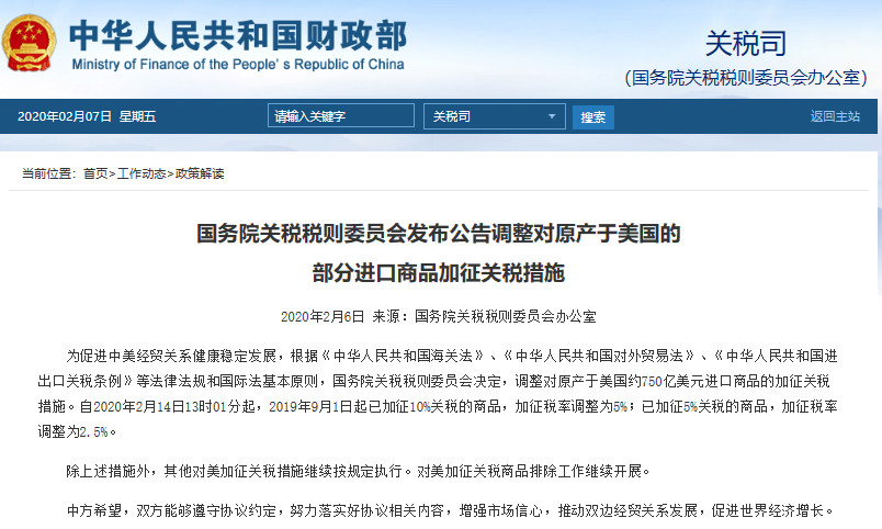 2月6日,国务院关税税则委员会发布公告,调整对原产于美国的部分进口商品加征关税措施。即自2020年2月14日13时01分起,调整《国务院关税税则委员会关于对原产于美国的部分进口商品(第三批)加征关税的公告》(税委会公告〔2019〕4号)规定的加征税率。该公告附件1第一、二部分所列270个、646个税目商品的加征税率,由10%调整为5%;第三、四部分所列64个、737个税目商品的加征税率,由5%调整为2.5%。