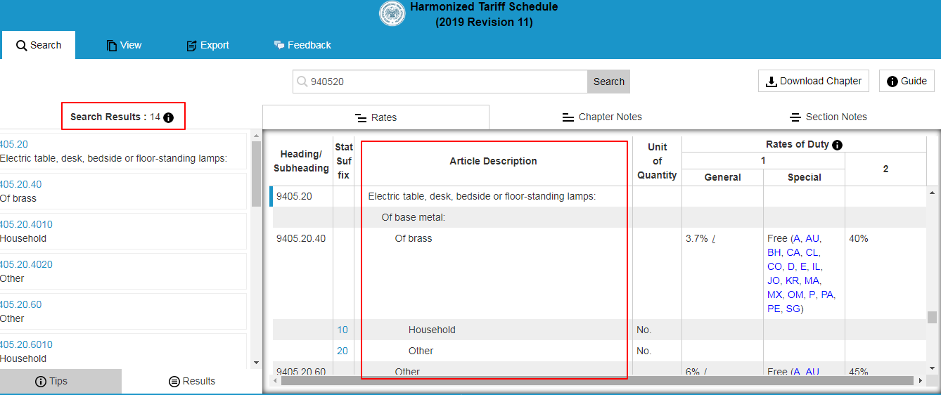 进入上述网站,在搜索框中输入中国HS CODE的前六位数,如台灯940520****,根据产品描述选择准确的HTS CODE。