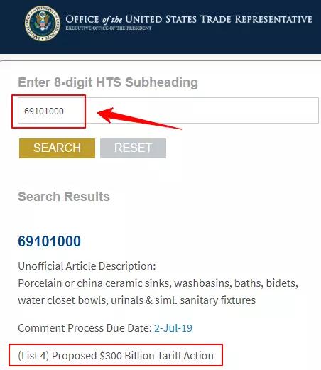 在最后一行“Search Tariff Lists”这里,则可以查询具体产品是否加税、何时开始加税。以陶瓷卫浴制品(HTS CODE:69101000)为例,在搜索框输入8位的HTS CODE,可以发现,它属于第四轮加税产品。