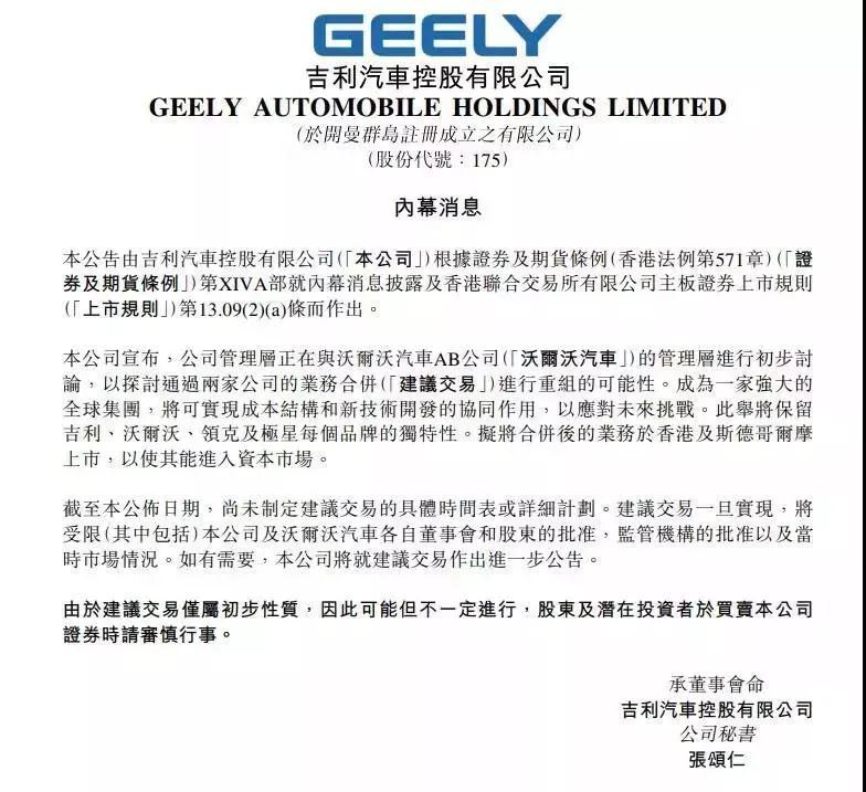 已有人阅读此文 - -2月10日,吉利汽车发布内幕公告称,公司管理层正在与沃尔沃汽车AB公司(沃尔沃汽车)的管理层进行初步讨论,以探讨通过两家公司的业务合并进行重组的可能性。重组后的资产将纳入吉利汽车香港上市公司,并将考虑未来在瑞典上市。