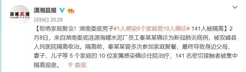 2月10日湖南省人民政府官网发布消息称,2月8日,娄底市涟源海螺水泥厂员工秦某林确诊为新冠肺炎病例,被双峰县人民医院隔离收治。隔离前,秦某林曾多次参加家庭聚餐,最终导致身边父母、妻子、儿子等5个家庭的10位家属感染,确诊住院治疗,141名密切接触者被集中隔离观察。