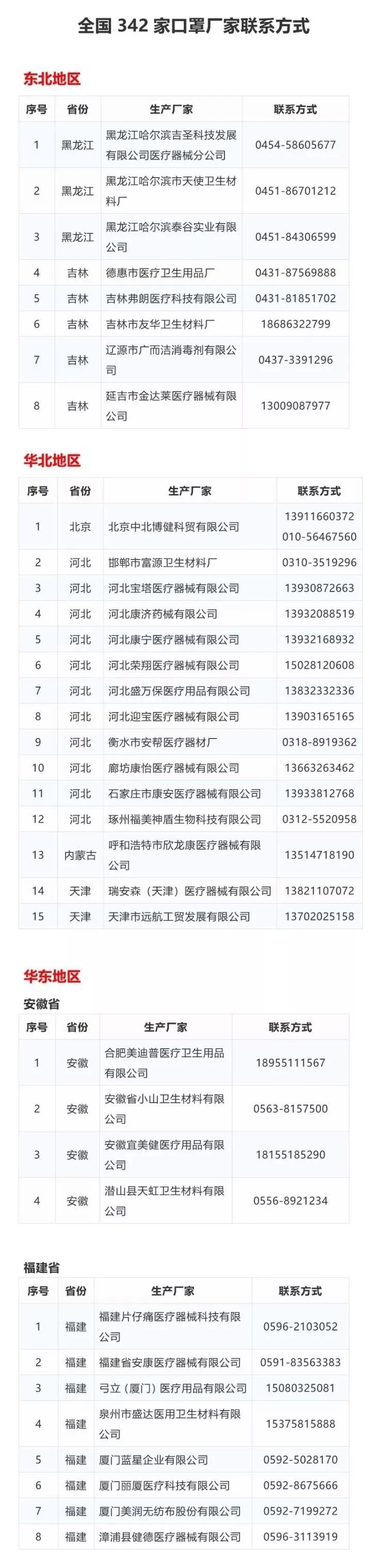 另外,全国342家口罩生产厂家联系方式发给你们,请各企业积极联系,争取买到更多口罩,争取早日开工。