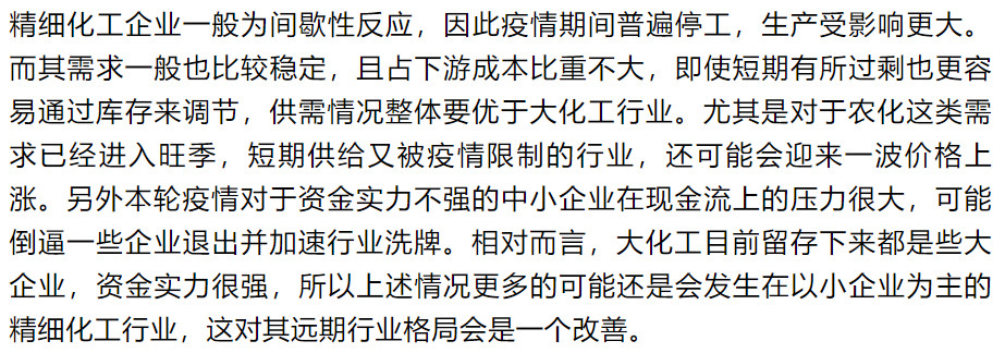 随着疫情初步得到控制,近期各行业都将迎来全面复工,此时也有必要审视一下疫情到底对今年化工行业景气有多大影响。所有周期分析本质上都是供需分析,由于大化工必须连续化生产的特点,在疫情期间也不会停工,除湖北和部分精细化工企业外,整体行业供给受影响并不大。而需求端则普遍面临更下游的延迟复工,受负面影响很大,节后很可能会因为库存压力出现大面积的降价促销,一季度化工业绩肯定是很差的,这应该也是市场的共识。对后续需求虽然市场普遍认为更多的只是后置而已,长期影响并不大,但仅就今年而言有些需求确实是被消灭掉了,后续也很难再弥补,如成品油;有些如建筑、纺织等看似有需求后置逻辑,但相比疫情前应该还是会有下滑。就我们判断,炼化行业应该是确定性受损,其他大化工行业的周期性机会可能也要等到下半年超额库存被消化之后,部分疫情期间停产的精细化工行业可能会受益于供给实质性减少叠加需求后置带来的供需错配和由此引发的价格上涨,整体而言疫情对化工企业全年业绩的综合影响应该还是弊大于利。对于不同行业受到的具体影响,我们判断如下: