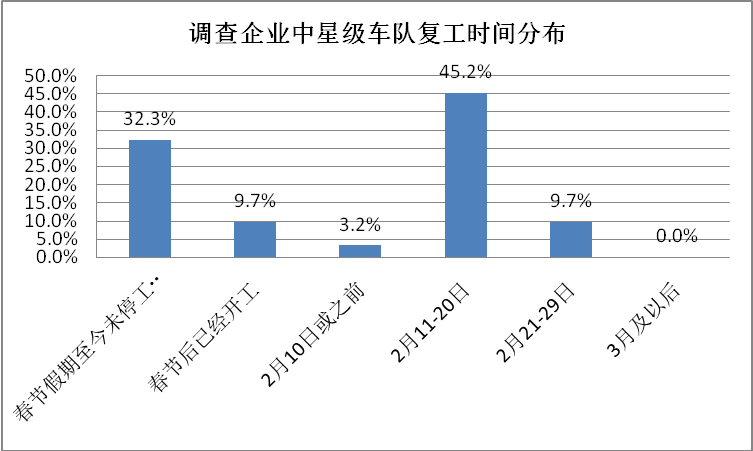 中国物流与采购联合会的调查数据显示,85%的企业反映疫情对企业经营造成较大影响,其中反映影响较大的占50%,部分企业经营暂时停顿。还有7%的企业反映影响严重,可能出现破产倒闭风险。被调查企业中,2月10日后开工的占58%,但是据调研企业反映,企业复工复产形势严峻,多地存在延期复工问题。星级车队复工情况好于行业平均水平,有32.3%的车队春节至今未停工停产。