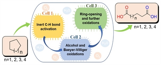 “此外,利用理性设计获得的大肠杆菌微生物组作为催化剂,可以实现多种环烷烃或环烷醇(C5~C8)得到不同α,ω-二元羧酸的合成,充分证明了该方法的普适性。最后,将整个生物转化反应在发酵罐进行放大反应,成功实现了己二酸产物的放大制备,这一人工生物合成体系为实现生物法大规模合成α,ω-二元羧酸奠定了重要基础。”李爱涛说。