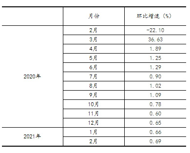 根据季节调整模型自动修正结果,对2020年2月至12月份规模以上工业增加值环比增速进行修订。修订结果及2021年1、2月份环比数据如下: