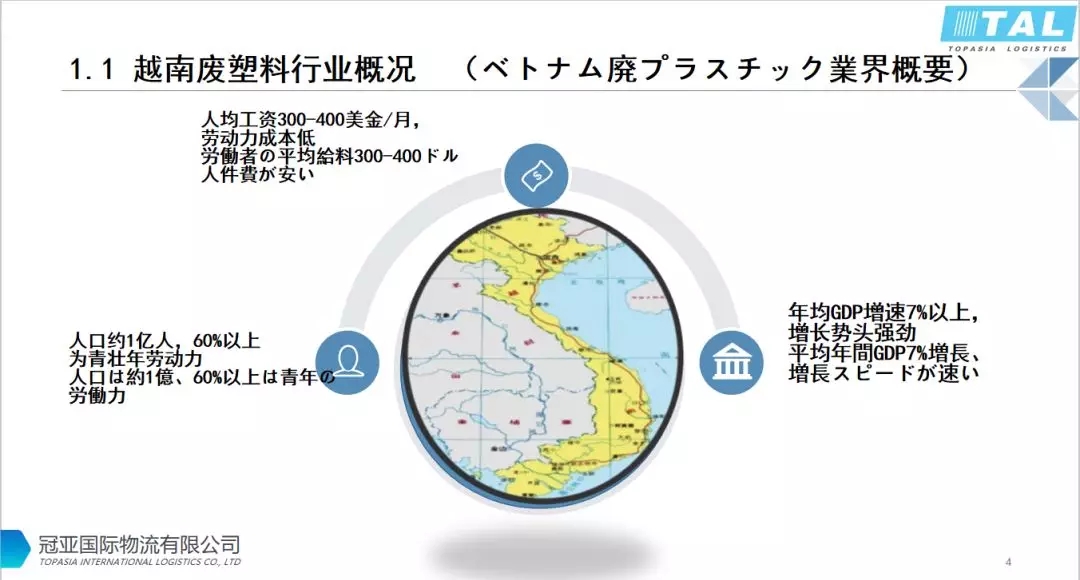 越南废塑料需求位居东南亚各国之首,再生塑料在越南的市场有PET,PP,PE,PS,ABS,PA。主要进口港口:海防,胡志明。