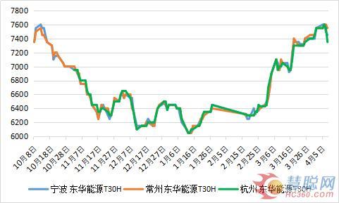 以华东地区牌号为东华能源T30H的产品为例,从图中可以看出,上周初PP产品报价延续节前涨势,随后报盘下跌,周五下调明显。其他地区产品也随原油价格波动与东华能源T30H产品一样,有类似调整。
