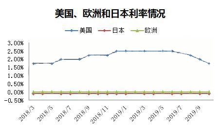 全球经济放缓,中美、欧美及美日等贸易战加剧经济下行压力,全球央行纷纷放水来降低实体经济融资成本来提振经济。美国自2019年7月以来已3次降息。此外,美联储自10月15日开始每月购买600亿美元短期国债,并至少维持至2020年2季度;欧央行9月宣布下调存款便利利率10BP至-0.5%,同时宣布将实行两级分级利率体系和新一轮QE;日本10月31日修改前瞻性指引,表示如果达成通胀目标的动能进一步走弱,利率水平将保持在目前的水平甚至更低,为日后“再开闸放水”打开大门。