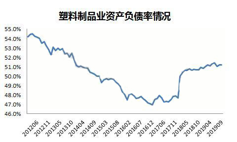 中国塑料制品行业的资产负债率从2016年12月后持续走高,9月份在51%左右,化工制品业则高达55%。两个行业资产负债率处于40-60%合适区间,化工品制造业略偏高。国资委以国有资产负债约束以资产负债率为基础控制指标,对于不同行业类型国有企业进行分类管理,并实行动态调整。根据以往的标准,2018年国有工业企业资产负债率预警线为65%,重点监管线为70%。对远期目标明确提出要促使高负债国有企业资产负债率尽快回归合理水平推动国有企业平均资产负债率到2020年年末比2017年年末降低2个百分点左右。从资产负债率角度看,化工原料和塑料制品的杠杆相对不高,有望能够更可能获得融资,享受降低的融资成本。9月份塑料制品企业累积利润同比增12.9%,化工制造业累积利润同比下降13%,两者比较下,化工制品业资产负债率高、利润同比下降,塑料制品企业资产负债率低,也利润同比尚好,塑料制品作为原料的终端,有一定经济韧性。