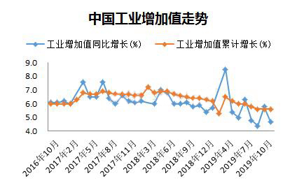国际统计局最新公布10月份数据显示经济持续下行压力仍旧较大。2019年10月份,规模以上工业增加值同比实际增长4.7%(以下增加值增速均为扣除价格因素的实际增长率),比9月份回落1.1个百分点。从环比看,10月份,规模以上工业增加值比上月增长0.17%。1—10月份,规模以上工业增加值同比增长5.6%。