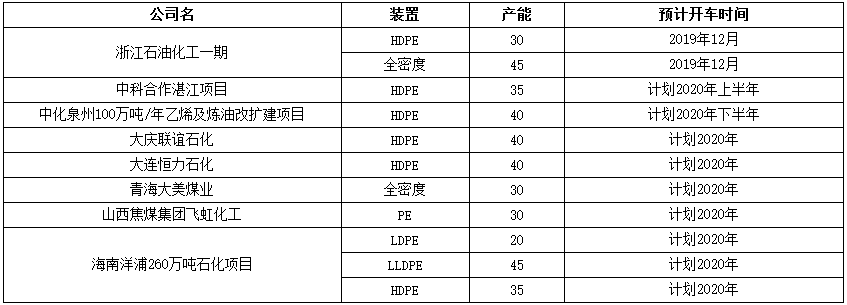 2019年年内中安联合35万吨LLDPE装置已经于7月30日开车生产,宁夏宝丰二期30万吨HDPE装置已经于9月27日投料生产,算上初步计划四季度投产的浙江石化来说,截止2020那边预期投产装置初步预计为390万吨。