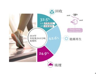 2018年欧洲共收集了2910万吨废塑料,其中32.5%的废塑料进行了回收再生,42.6%的废塑料进行了能源转换,24.9%的废塑料进行了填埋处理。