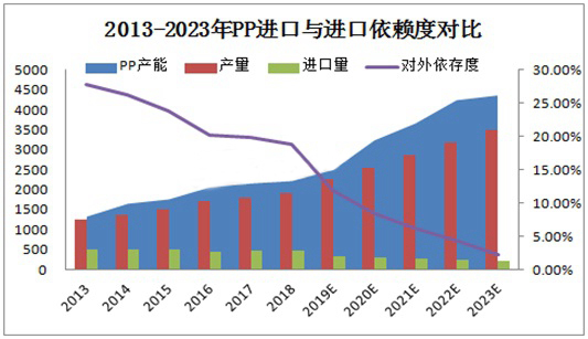 分析原因:一、国内产能集中,尤其煤化、PDH、MTO不同原料产能激增,不断提升国内产能自给能力;二、同质化产品竞争激烈化,进口呈现两极分化,均聚进口量逐步减量,高端专用产品进口仍以进口为主;三、国内科研水平不断提升,专用产品研发提升后,对外依赖度将逐步下降。预计:2019-2023年进口量将会降至200万吨附近,进口依赖度降至2.23%附近。