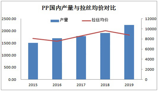 国内PP产量与拉丝均价呈现较为明显反比趋势,2016、及2018-2019年表现尤为明显。2016年国内PP产量经历了2014-2015年继续扩张后,年产量高达1695.69万吨,当年国内拉丝均价由2015年8090元/吨降至7570元/吨,降幅6.43%。2018年是近几年产能增速相对较慢的一年,受整体扩能放缓且国内大型企业检修集中支撑,国内拉丝均聚同比2017年涨幅12.7%。2019年1-10月份整体扩能202万吨,均价同比2018年跌幅8.35%。