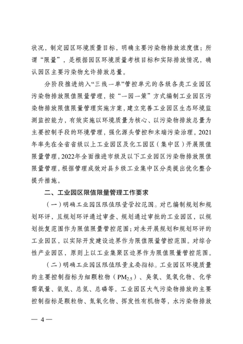 工业园区污染物排放限值限量管理,指的是通过开展工业园区及周边大气、水环境质量监测以及主要污染物排放总量测算,有效实施以环境质量为核心、以污染物排放总量为主要控制手段的环境管理制度体系。所谓“限值”,是根据区域生态环境质量状况,制定园区环境质量目标,明确主要污染物排放浓度值;所谓“限量”,是根据园区环境质量考核目标和实际排放情况,确认园区主要污染物允许排放总量。工业园区既是全省经济发展的主要载体,又是治污攻坚的主战场、主阵地。江苏省将分批推进全省工业园区限值限量管理工作,2021年底前全面开展全省172个省级以上工业园区以及化工园区污染物排放限值限量管理;2022年底前,全面开展全省市级及以下工业园区(集中区)污染物排放限值限量管理。