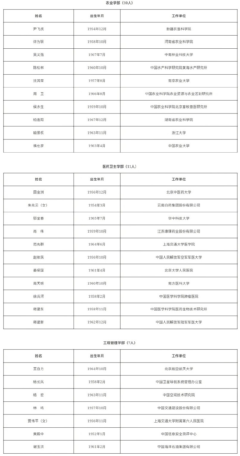 在新当选中国工程院院士中,机械与运载工程学部11人,信息与电子工程学部10人,化工、冶金与材料工程学部8人,能源与矿业工程学部9人,土木、水利与建筑工程学部10人,环境与轻纺工程学部8人,农业学部10人,医药卫生学部11人,工程管理学部7人。