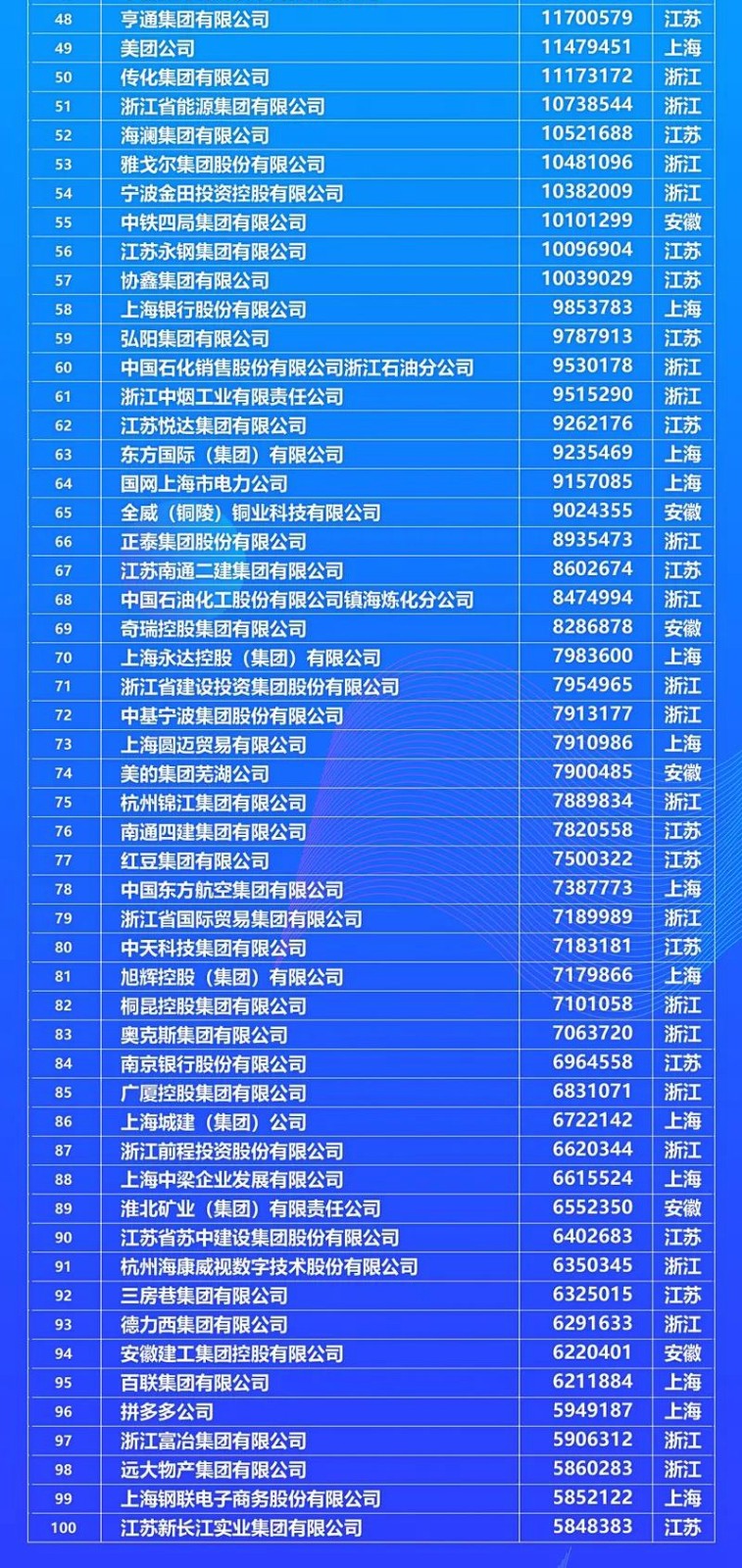 按上榜百强企业数量计,浙江最多,达到36家,比上年增加1家;上海次之,达到32家,比上年增加2家;江苏为23家,比上年减少3家;安徽9家,与上年持平。
