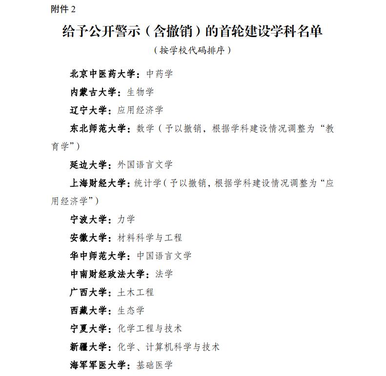首轮建设成效并未完全达到预期、相比同类学科在整体发展水平、可持续发展能力和成长提升程度方面相对偏后的部分学科给予警示,相关学科应加强整改,2023年接受再评价,届时未通过的,将调出建设范围。