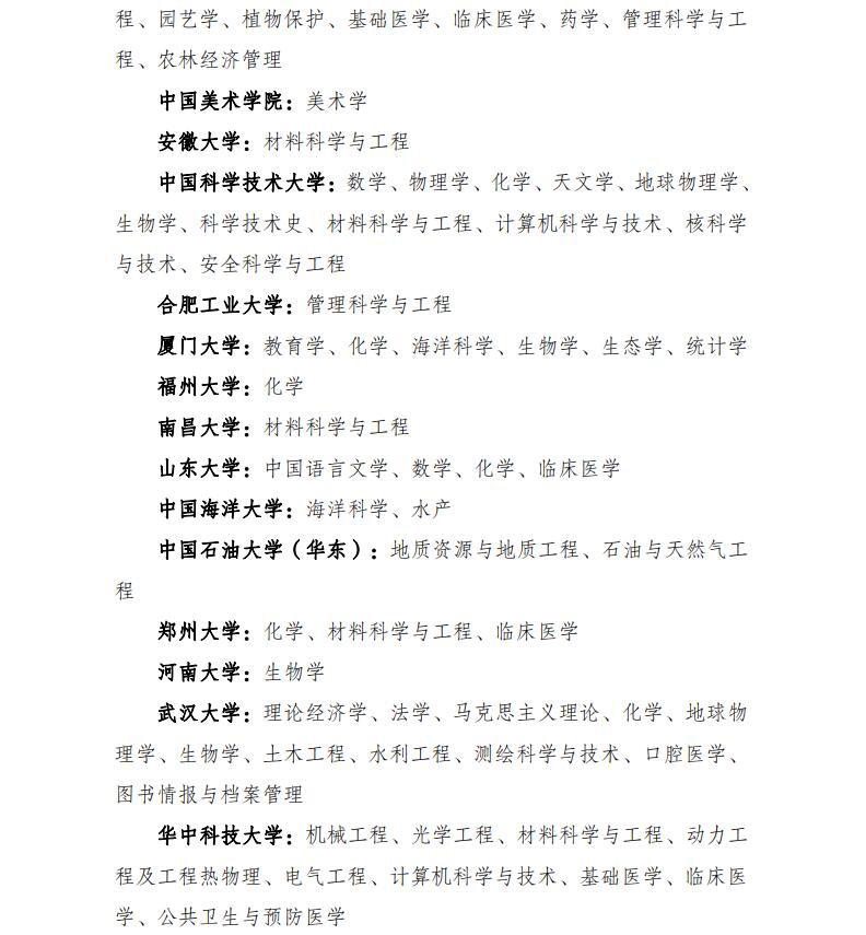 化学学科重点建设的高校有22所:南开大学、天津大学、吉林大学、东北师范大学、复旦大学、上海交通大学、华东理工大学、南京大学、浙江大学、中国科学技术大学、厦门大学、福州大学、山东大学、郑州大学、武汉大学、湖南大学、中山大学、华南理工大学、四 川大学、兰州大学、新疆大学、中国科学院大学。