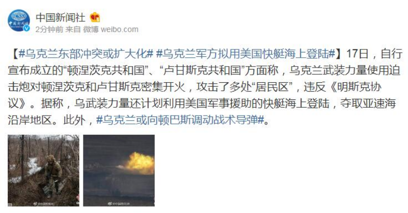 2月17日,乌克兰局势更加扑朔迷离。自行宣布成立的“顿涅茨克共和国”、“卢甘斯克共和国”方面称,乌克兰武装力量使用迫击炮对顿涅茨克和卢甘斯克密集开火,攻击了多处“居民区”,违反《明斯克协议》。据称,乌武装力量还计划利用美国军事援助的快艇海上登陆,夺取亚速海沿岸地区。此外,乌克兰或向顿巴斯调动战术导弹。