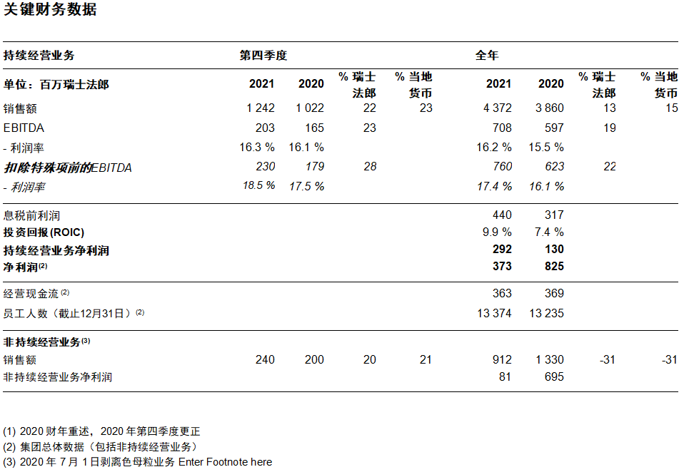 ● 2021年第四季度:在强劲的定价和销量增长驱动下,以当地货币计算,持续经营业务的销售额增长了23%,达12.42亿瑞士法郎