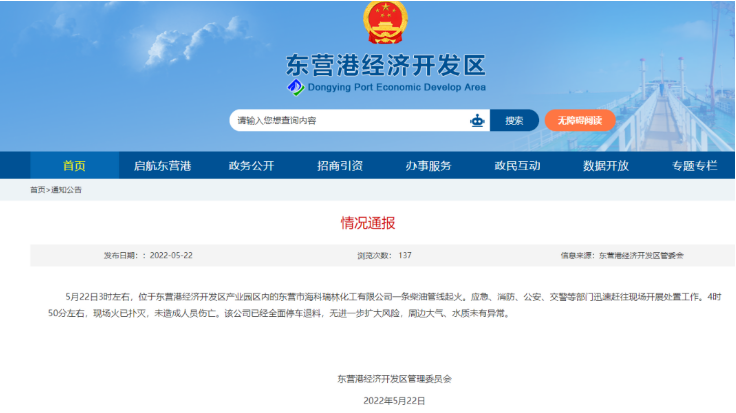 5月22日3时左右,位于山东省东营港经济开发区产业园区内的东营市海科瑞林化工有限公司一条柴油管线起火。应急、消防、公安、交警等部门迅速赶往现场开展处置工作。4时50分左右,...