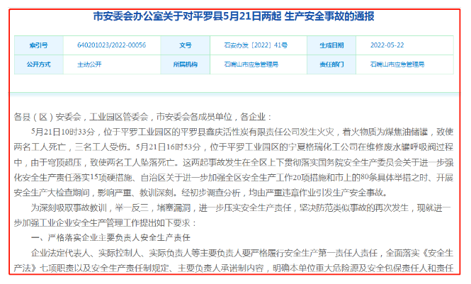 5月21日10时33分,位于平罗工业园区的平罗县鑫庆活性炭有限责任公司发生火灾,着火物质为煤焦油储罐,致使两名工人死亡,三名工人受伤。