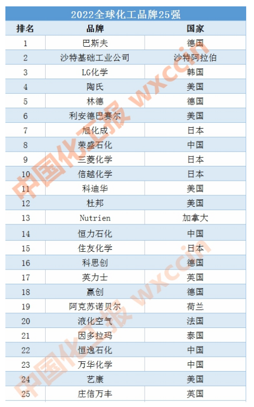2022全球化工品牌25强出炉!荣盛石化、恒力、恒逸、万华上榜