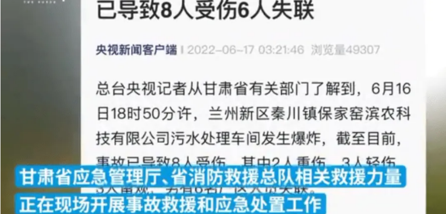 6月16日下午18时,兰州新区秦川镇保家窑滨农科技有限公司污水处理车间发生爆炸。事故造成8人受伤,其中2人重伤,3人轻伤,3人留观,6名电厂人员失去联系。 事故发生后,甘肃省应...