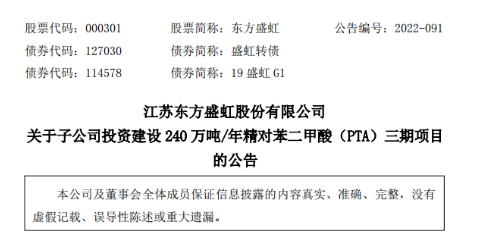 东方盛虹计划投资39.39亿元建设精对苯二甲酸(PTA)三期项目