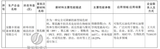 安徽丰原福泰来聚乳酸入选安徽省首批新材料推广应用指导目录