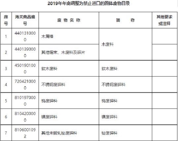 二、将不锈钢板废碎料、钛废碎料、木废碎料等16个种类固体废物(见配件2),从《限制进口类可用作原料的固体废物目录》《非限制进口类可用作原料的固体废物目录》加入《禁止进口固体废物目录》,自今年12月31号日起实行。