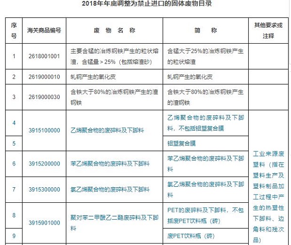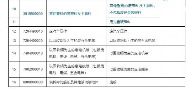 一、将废五金类、废船、废轿车压件、冶炼厂渣、工业生产来源于废旧塑料等16个种类固体废物(见配件1),从《限制进口类可用作原料的固体废物目录》加入《禁止进口固体废物目录》,自201812月31号日起实行。