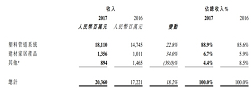 在本次调查中,中国联塑监事会主席兼行政总裁左满伦表明,企业17年各版块持续增长,预估2018总体收入会持续保持稳进的提高,而建材家居商品和其他业务因为数量较低,可能维持持续增长。