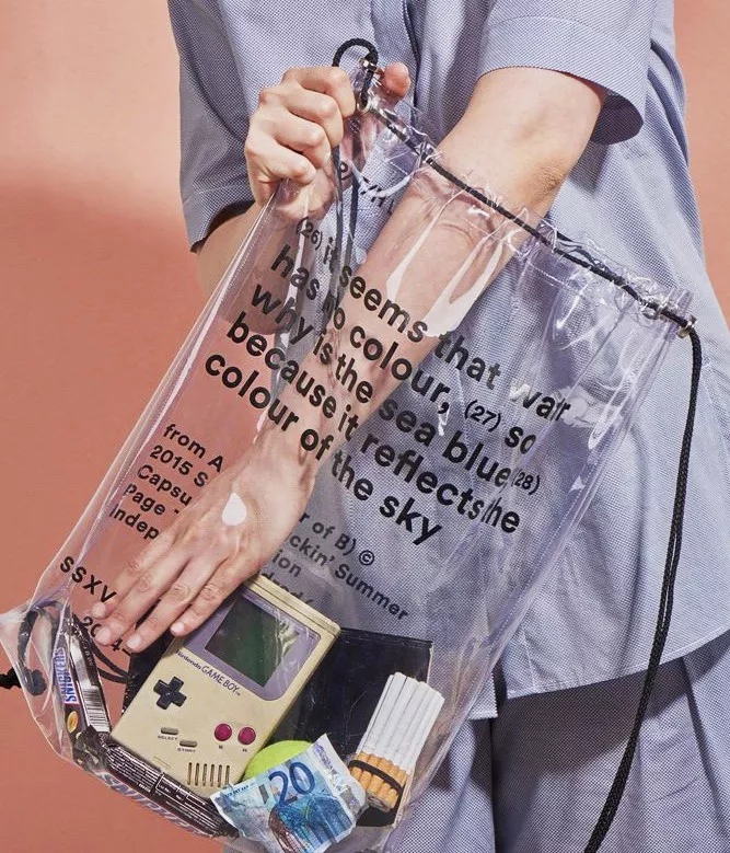 那样包包的益处是能够将你包包里意味着你品位的好物品一次性展露无遗,如果你觉得那样太没隐私保护,在PVC材料的包内在套进一个一切正常的包包也是如今很时兴的游戏玩法。