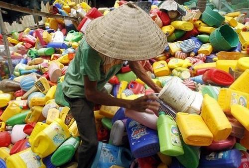 越南河内南端约40千米的Xa Cau村,一名小伙立在一堆废弃塑料产品上