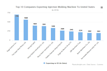 据该企业统计分析,美国2017年十大关键注塑设备進口经销商排行中,恩格尔稳居第一,它一共向美国销售市场出口了951套液压、中小型注塑机。略逊一筹为株式日本国制钢所(Japan Steel Works Ltd),共向美国出口568台注塑机。