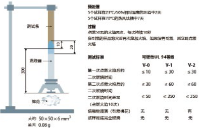 该测试必须一个测试条(125毫米 x 12.5毫米 x 薄厚)和20毫米长、50瓦的甲烷气体火苗。在竖直点燃测试(V测试)中,火苗引燃测试样版2次,每一次10秒。每一次引燃火苗以后,在棉絮的协助下评定余燃時间和熔化物滴下状况。图1所显示为试件的预备处理、测试全过程和塑胶材料的易燃性级别规范。