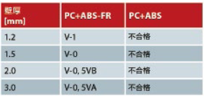 表1 根据壁厚的UL94 V阻燃等级测试:阻燃性和非阻燃性PC ABS的测试結果(来源于:LKT)