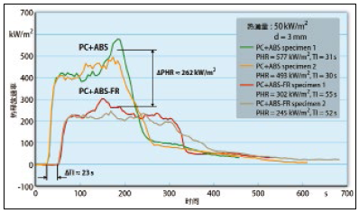 图3 锥型量热法:阻燃性和非阻燃性 的PC ABS曲线图在热通量为50 kW/m2的标准下到锥型量热仪中测量(来源于:LKT)