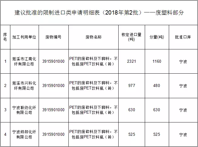已有人阅读此文 - -继12月26日环保部固废中心公示公告2018第一批限定进口类申请办理明细表后,29日又公示公告了第二批限定进口类申请办理明细表(2018第二批),现有废塑料、废旧纸张、废旧金属等共33家公司。在其中废塑料公司4家,获准进口总产量4453吨。