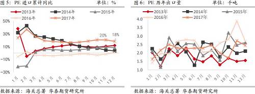 从17年进出口状况看来,PE 主要表现为显著的进口增加量,1-11月份总计进口 1071 万吨级,总计同比增速 182 万吨级,总计同比增幅为 20.44%,预估全年度进口增长速度亦在18% 。出口层面,因PE平均出口不够三万吨,可忽视。