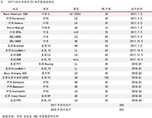归根结底,大家觉得主要是伴随着原材料质轻化的危害,2016 年刚开始外盘迈入了比较显著的PE 投产高峰期,这一发展趋势或将持续到 2018 年。2016-2017 年外盘投产高压聚乙烯生产能力累计约 1000多万吨,约占高压聚乙烯总生产能力的 10%。2018 年预估依然有400多万吨装置投产,外盘装置也常常遭遇投产推迟的难题,但现阶段许多印尼和英国装置是在2020年四季度投产,且18年投产装置中,在其中一部分装置已在2017年进行试运行的装置,考虑到装置从投产到调节好到高产有待一定的時间,再再加航次,大家预估四季度和2020年一季度投产装置的进口增加量或将在2020年的4-5月份以后会出现显著的反映。因外盘投产规模很大,提议紧密追踪外盘投产进展。