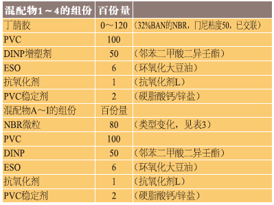 混配物1~四分别是于PVC环氧树脂中逐渐提升32�N 50门尼黏度的化学交联NBR到较大 120分量。整体而言,从较低NBR量直到NBR量达到120分量的混配物4,可观查到缩小永久性变形性能与在IRM903油中老化的容积转变均得到持续改进。