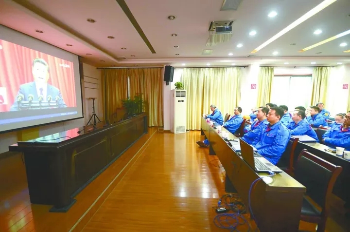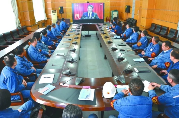 陕西省未来新能源化工公司分六个主会场,另外充分利用网络、app客户端等,总共机构六百七十余人集中化收看接听十九大开幕会直播间,占该企业在籍总人数的百分之三十五。图为收看现场直播。