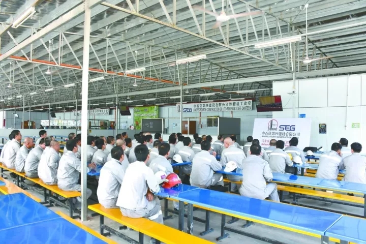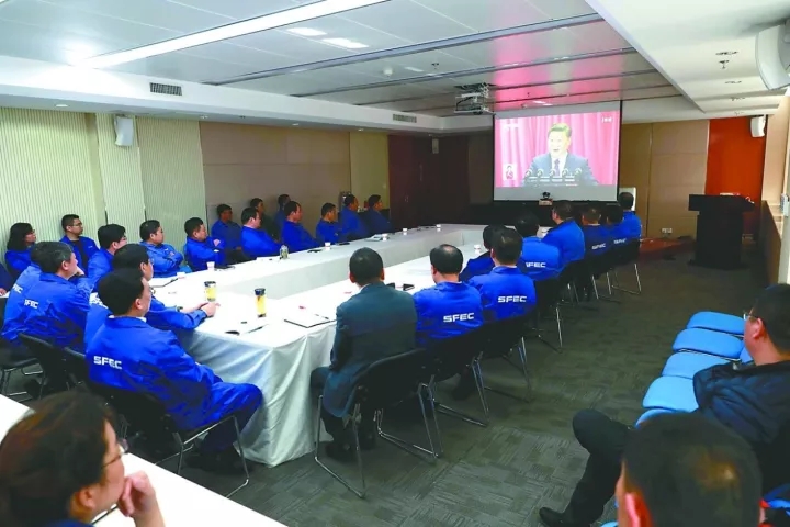 中国石化四建公司组织行政机关、基层及其遍布在中国的每个外省市建筑项目部、海外建筑项目部员工收看了十九大揭幕时况,大伙儿深受鼓舞。图为企业新加坡建筑项目部的员工收看直播间时况的场景。