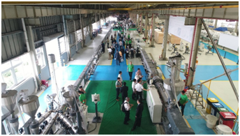机器设备演示会当场展现了一条3层玻纤提高PP-R管材挤压生产线,用以生产制造直徑63mm,壁厚8.6毫米的管材。生产线长短为66米,当场演试的生产制造生产量为350KG/钟头,角速度为3.95米/分鐘。