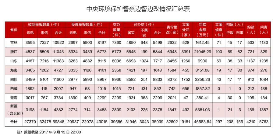 截止2017年9月15日,督察组督办的自然环境举报,地区已受理35039件,受理率做到88.5%。在其中,勒令整改32602家;立案侦查惩罚9181家,处罚46583.84万余元;立案调查297件,行政部门和刑拘364人;提醒谈话4210人,责任追究576三人。